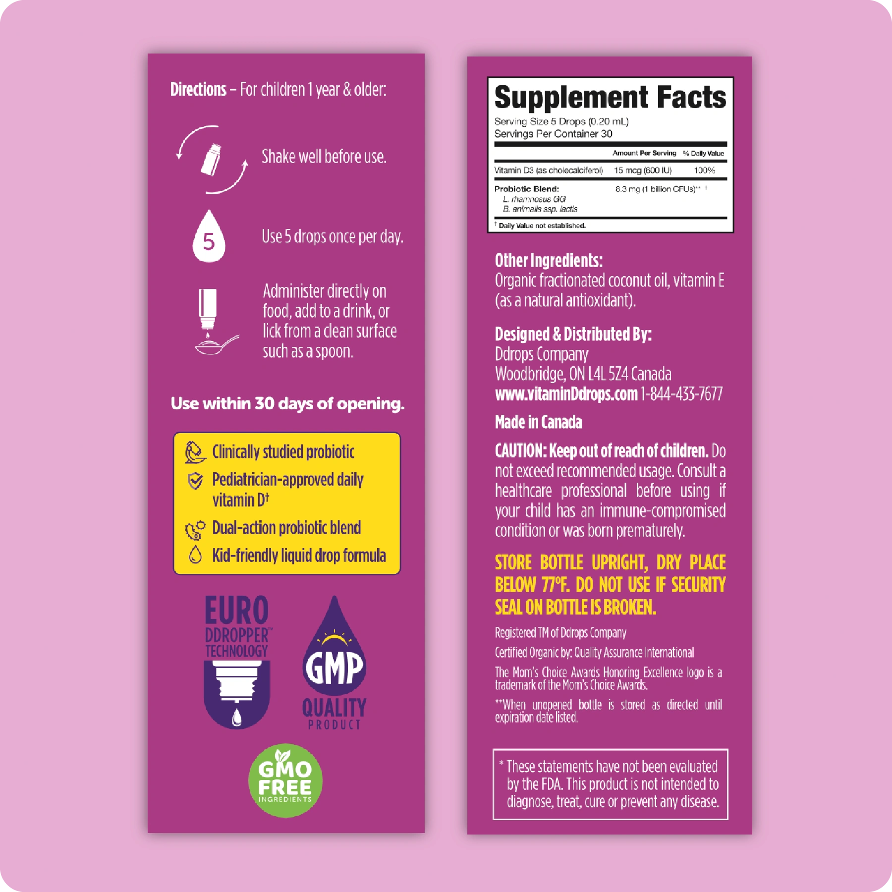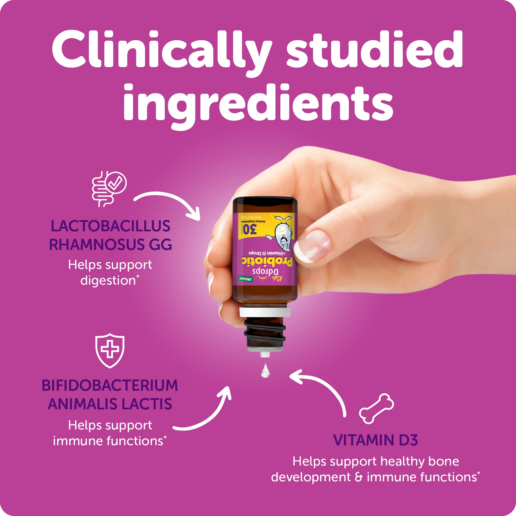 Made with two clinically studied probiotic strains and pure vitamin D3.
