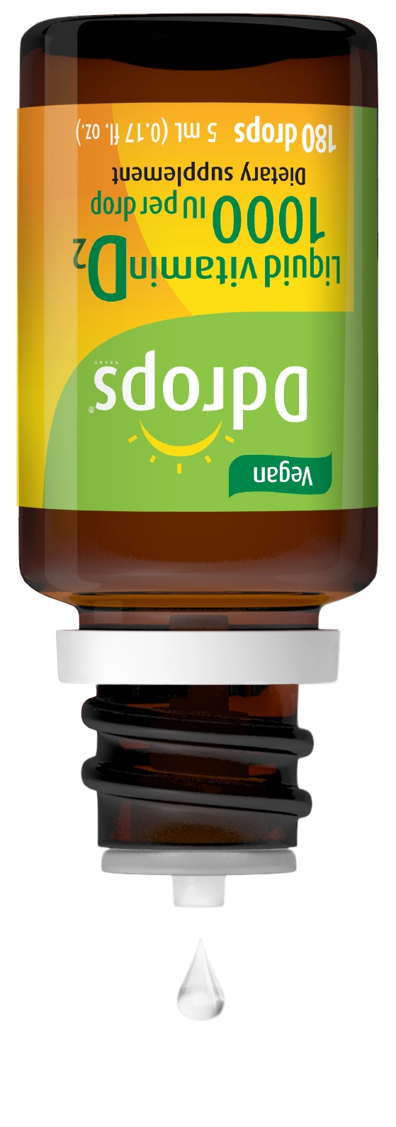 Daily recommended 1000 IU of vitamin D2 in just one drop.